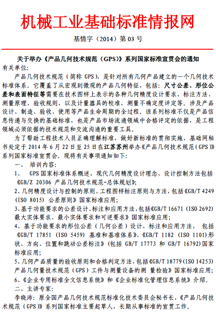 关于举办《产品几何技术规范(GPS)》系列国家标准宣贯会的通知