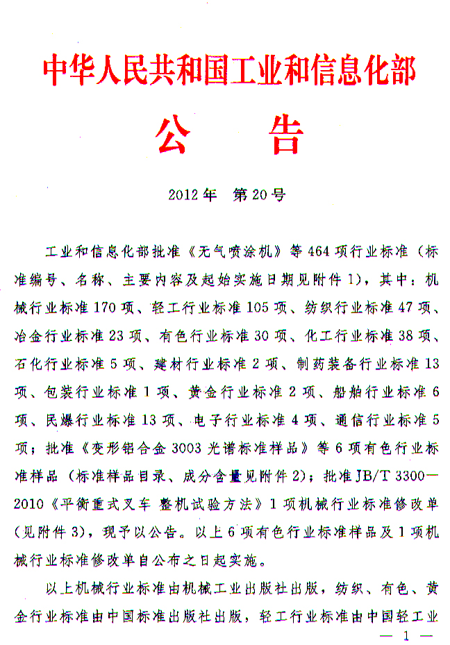 工业和信息化部公告(2012年第20号)批准464项行业标准
